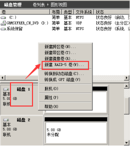 2.3右键点击"磁盘 1",选择"新建 RAID-5 卷";