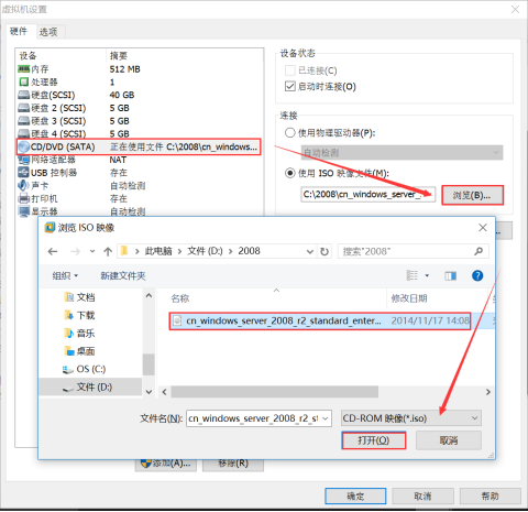 1.5同样的方法,再添加2块同样大小的硬盘,选择"CD/DVD(SATA)",在右侧窗口选择使用的ISO映像文件,这里我们添加的是"Windows_Server_2008"的 ISO,文件在拷贝的工具目录下,最后点击"确定";