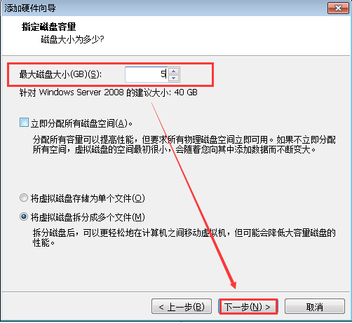 1.4最大磁盘大小,选择"5G",点击"下一步",后完成。