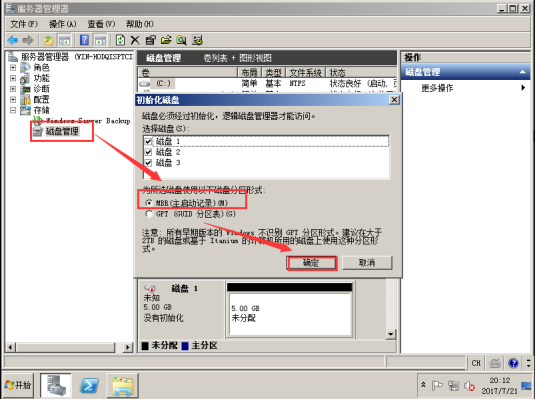 2.2 点击开始菜单",选择"管理工具",点击"服务器管理器",点击"存储"下的"磁盘管理"进入磁盘管理。选择3块添加的硬盘,转换成"MBR"格式,点击"Ok"。