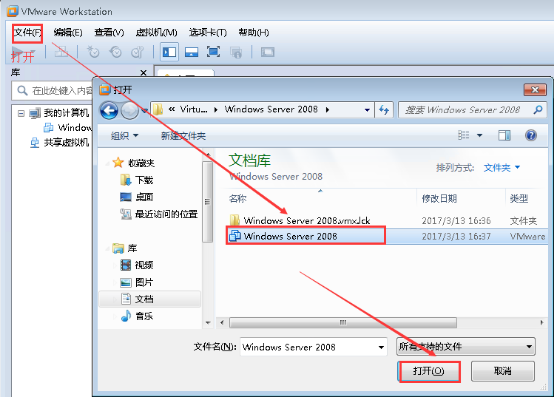 1.1双击打开VMware工具,"文件"打开windows server 2008 系统。