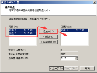 2.5将左边两个硬盘磁盘 2和磁盘 3,添加到右边,点击"添加";