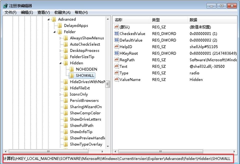 HKEY_LOCAL_MACHINE\Software\Microsoft\Windows\CurrentVersion\Explorer\Advanced\Folder\Hidden\SHOWALL