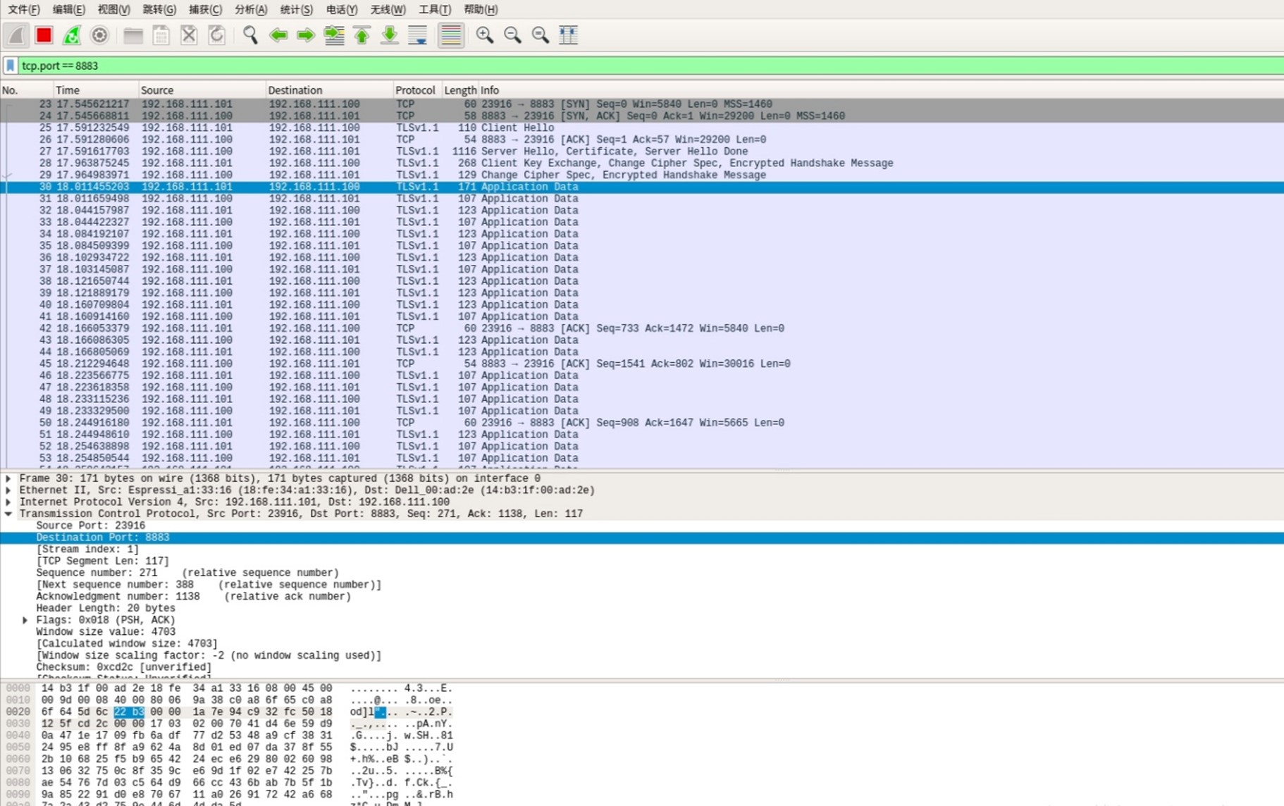 数据包5 (No. 30) 握手完成。开始上层数据传输。SSL/TLS 单向认证流程的