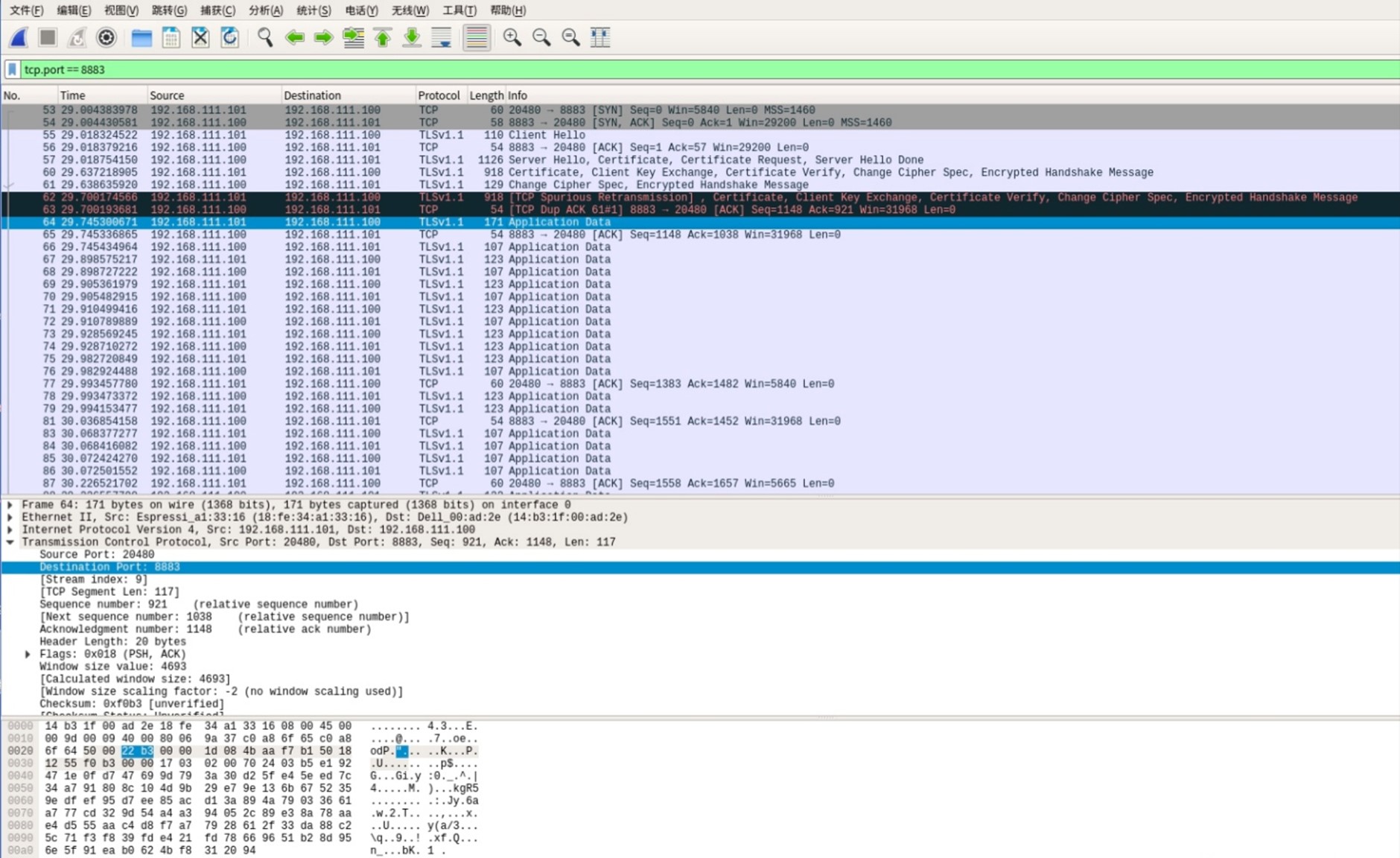 数据包5 (No. 64) 握手完成。开始上层数据传输。SSL/TLS 单向认证流程的