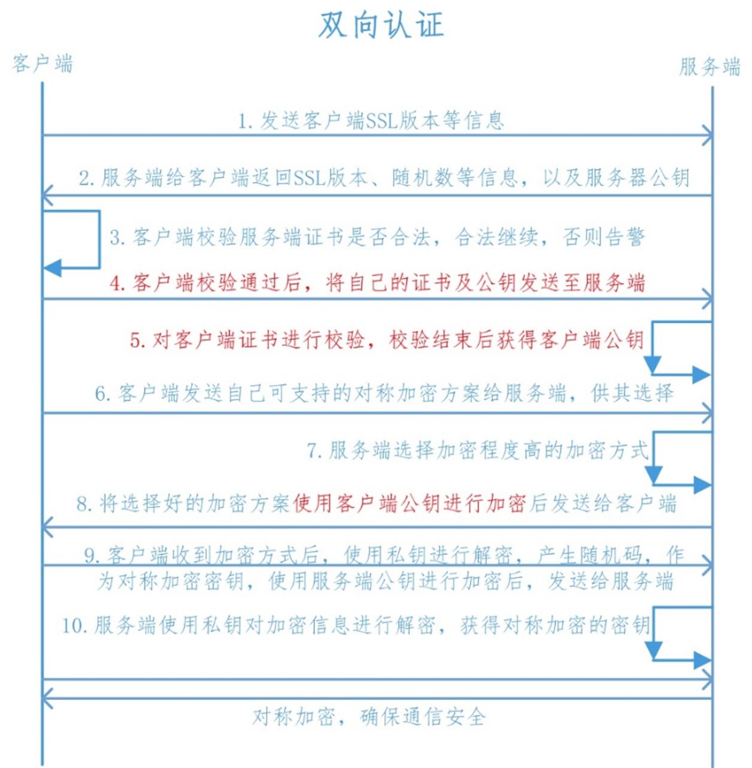 双向认证指的是相互校验,服务器需要校验每个 client,client 也需要校验服务器。