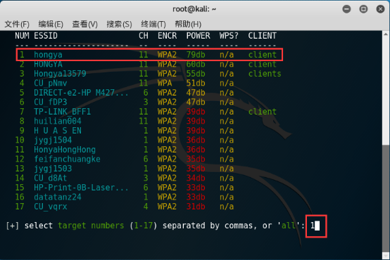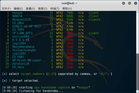 4.3扫描到目标 WiFi 后,按"Ctrl+C"组合键停止扫描,并输入目标 WiFi 的"NUM"代号,按下回车键开启破解。