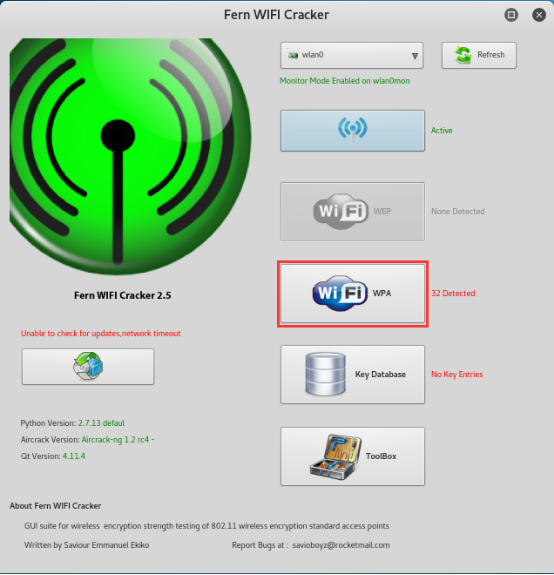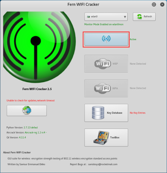 Fern Wifi Cracker 是一种无线安全审计和攻击软件编写的程序,使用 Python 编程语言和 Python 的 Qt 图形界面库,该程序是能够破解和恢复 WEP、WPA、WPS 键和无线或以太网上运行其他基于网络的攻击基于网络的。