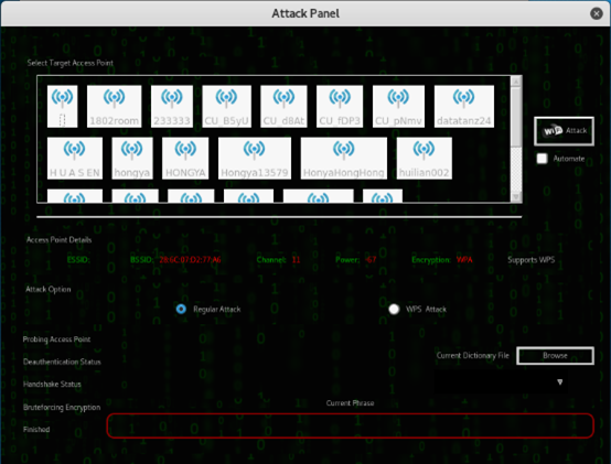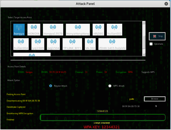WPA 目前没有加密体制的缺陷可被利用,破解 WPA 密码使用的是常规的字典攻击法。所以在破解方式上 WEP 和 WPA 有很大差异。