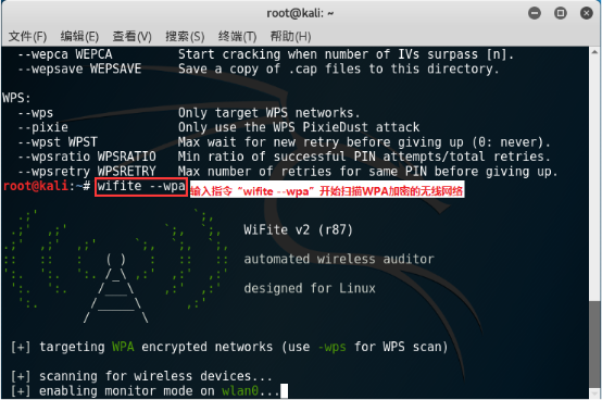4.2在终端窗口中,输入"wifite --wpa",启动 WiFite 工具,并自动扫描周围"WPA"加密的 WiFi。