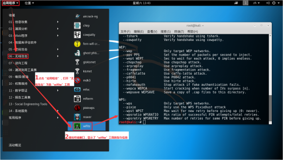 4.1在 Linux_Kali 虚拟机中,点击左上角的"应用程序"按钮,选择"无线攻击"选项下的"wifite",弹出的终端窗口中显示了 WiFite 工具的指令信息。