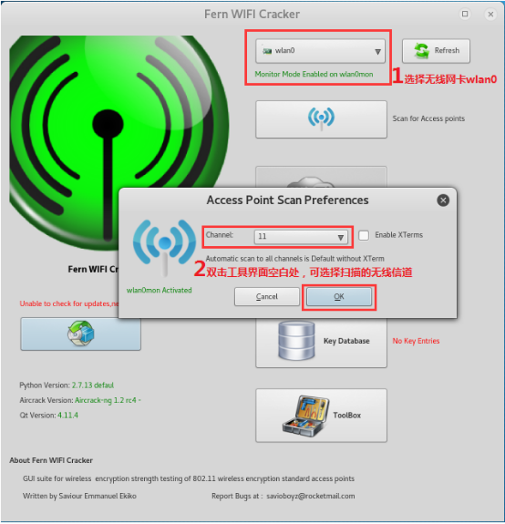 3.2在工具窗口最上方的下拉选单中选择无线网卡,并双击工具界面空白处,在弹出的选框中可以选择扫描的无线网络的信道,因为我们已知实验用 WiFi 的线道为:11,所以此处可直接选择"11",并点击"OK"确认。