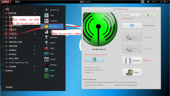 3.1在 Linux_Kali 虚拟机中,点击左上角的"应用程序"按钮,选择"无线攻击"选项下的"fern wifi cracker",弹出 Fern WiFi Cracker 工具窗口。