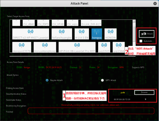 3.6选择我们开启的实验用 WiFi,这里选择的是"hongya",在右下角选择需要使用的密码字典,并填入一个连接此 WiFi的设备的 MAC 地址。设置完毕后,点击右上角的"WiFi Attack"按钮,开始破解。