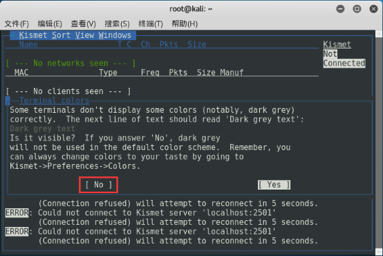 2.1启动 Kismet 工具后,弹出 Kismet 工具图形界面。该界面显示的是该工具是否是用终端默认的颜色,因为 Kismet 默认颜色是灰色,可能一些终端不能显示。这里不使用默认的颜色,所以单击"No"按钮。