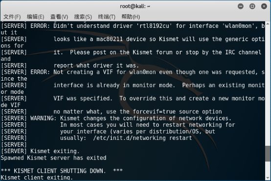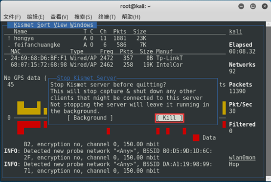 3.7点击"Quit"选项后,将显示下界面,在该界面单击"Kill"按钮,停止 Kismet 服务并退出此模式。