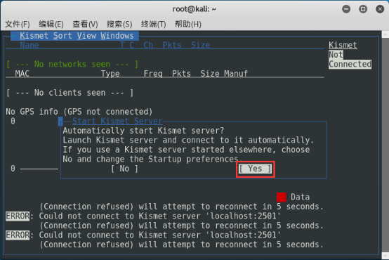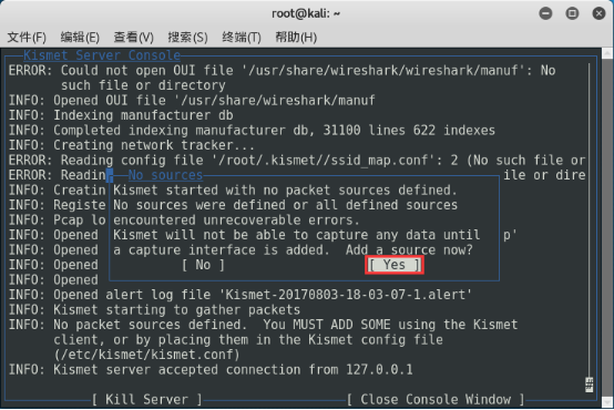 2.3该界面提示是否要自动启动 Kismet 服务。这里点击"Yes"按钮。