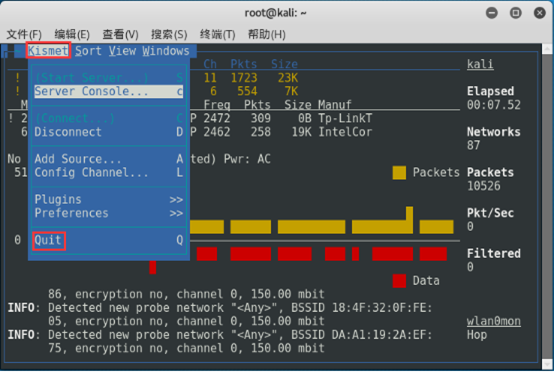 3.6退回 Kismet 扫描界面后,当运行扫描到足够的信息时,可停止扫描。此处在上方菜单栏选择"Kismet"下的"Quit"选项,退出 Kismet 工具。