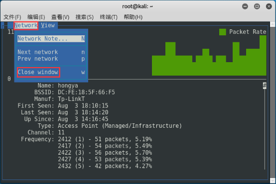 3.5当需要退回到 Kismet 扫描界面时,在上方菜单栏中选择"Network"下的"Close window"选项。