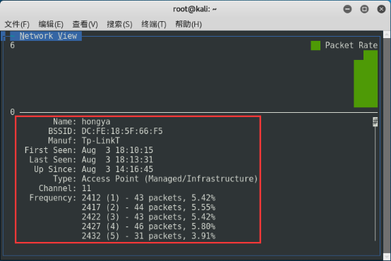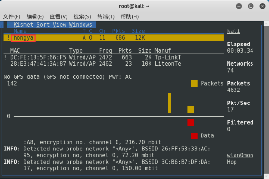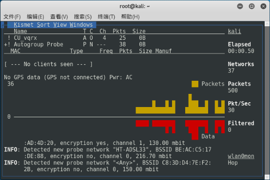 3.1在 Kismet 扫描界面可以看到 Kismet 工具扫描到的所有无线 AP 信息。在该界面显示了捕获包的时间,扫描到的网络数、包数等。
