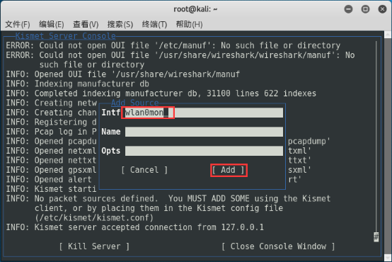 2.6在该界面指定无线网卡接口和描述信息。在"Intf"输入框中输入无线网卡接口,因为无线网卡已处于监听模式,所以此处输入"wlan0mon"。其它配置信息不设置。然后单击"Add"按钮。