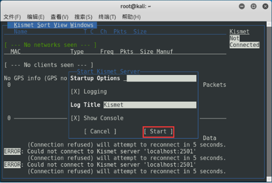 2.4该界面显示设置 Kismet 服务的一些信息。这里使用默认设置,并点击"Start"按钮。