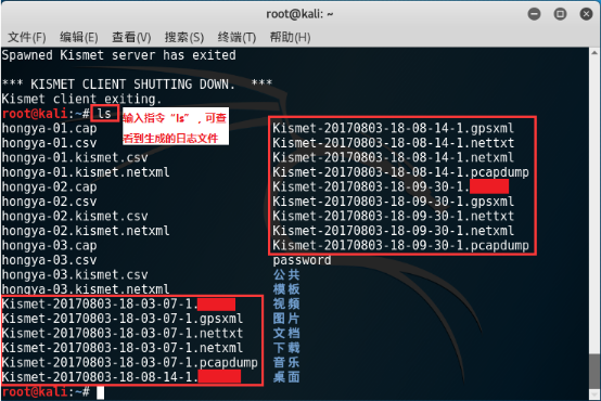 3.9这些日志文件,默认保存在 /root 目录。在这些日志文件中,显示了生成日志的时间。当运行 Kismet 很多次或几天时,用户可以根据这些日志的时间快速的判断出那个日志文件是最近生成的。接下来查看一下上面的日志文件,使用"cd"指令切换到 /root 目录(此处我们就在 /root 目录,无需切换),并使用"ls"命令查看生成的日志文件。