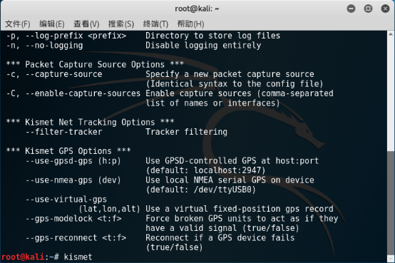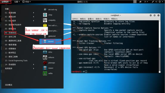 1.4在 Linux_Kali 虚拟机中,点击左上角的"应用程序"按钮,选择"无线攻击"选项下的"kismet",弹出的终端窗口中显示了 Kismet 工具的指令信息。