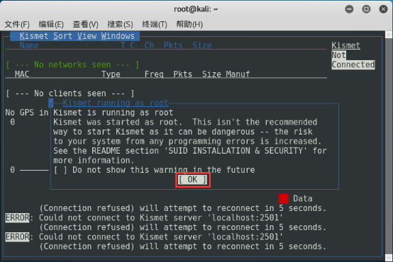 2.2该界面提示正在使用 root 用户运行 Kismet 工具,并且该界面显示的字体颜色不是灰色,而是白色的。此时,单击"OK"按钮。