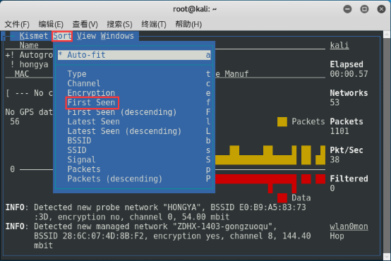 3.2在该界面只看到搜索到的无线 AP、信道、包大小信息,但是没有看到这些 AP 的 MAC 地址及连接的客户端等信息。如果想查看到其它信息,还需要进行设置,此处我们选择"Sort"下的"First Seen"选项。