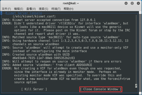 2.7在该界面选择界面下方的"Close Console Window"按钮。将进入 Kismet 扫描界面。