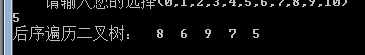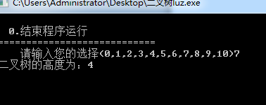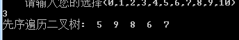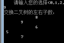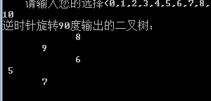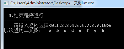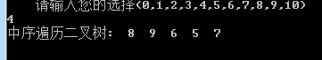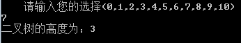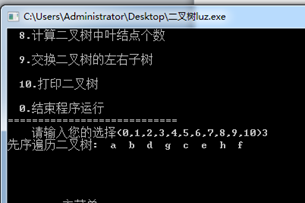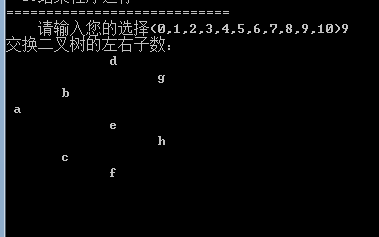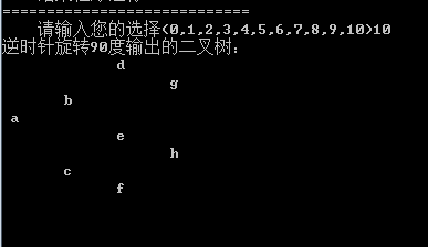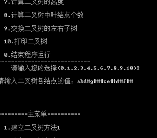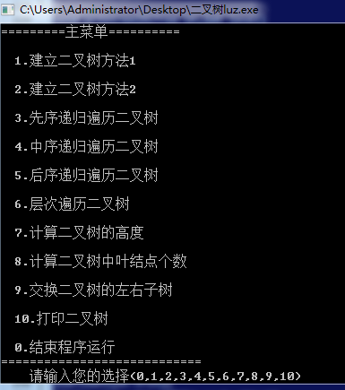在"请输入你的选择(0,1,2,3,4,5,6,7,8,9,10)"后输入数字选择执行不同的功能。要求首先输入1或2建立二叉树,才可以进行其他的操作。