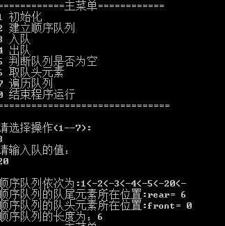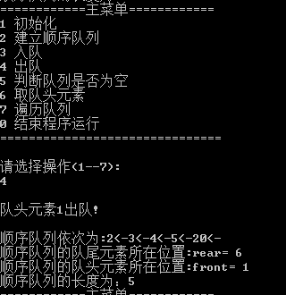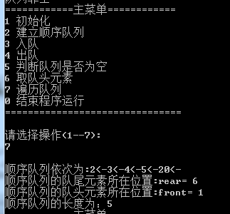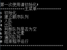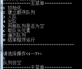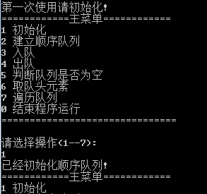 在"请输入你的选择(1,2,3,4,5,6,7,0)"后输入数字选择执行不同的功能。要求首先输入1初始化,才可以进行其他的操作。每执行一次功能,就会显示执行的结果(正确或错误)以及执行后队列的内容。