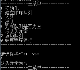 选择3:显示"请输入队的值:",要求输入入队元素的值