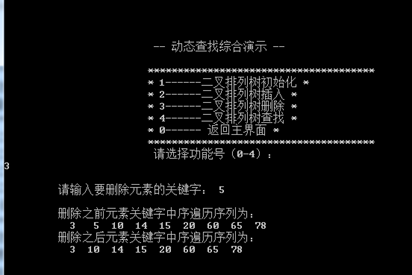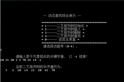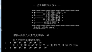 - 程序所能达到的功能。演示静态查找和动态查找,初始化查找表,顺序查找,折半查找,二叉排序树的初始化、插入、删除、查找操作。